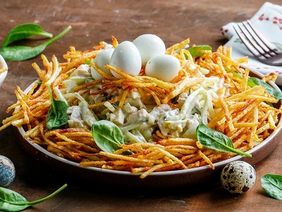 Сбалансированный обед не только утоляет голод, но и создает хорошее настроение, несмотря на ноябрьскую погоду. Заглянув в раздел салаты и закуски, вы обнаружите новое блюдо, которое подойдет не только для повседневного обеда, но и для банкета. Красиво оформленная трапеза никого не оставит равнодушным. Отличное сочетание ингредиентов в салате гнездо глухаря создает приятные вкусовые ощущения во время обеда. Повара, в процессе приготовления пищи, используют отборный картофель, лучшие шампиньоны, аппетитно хрустящие маринованные огурчики.